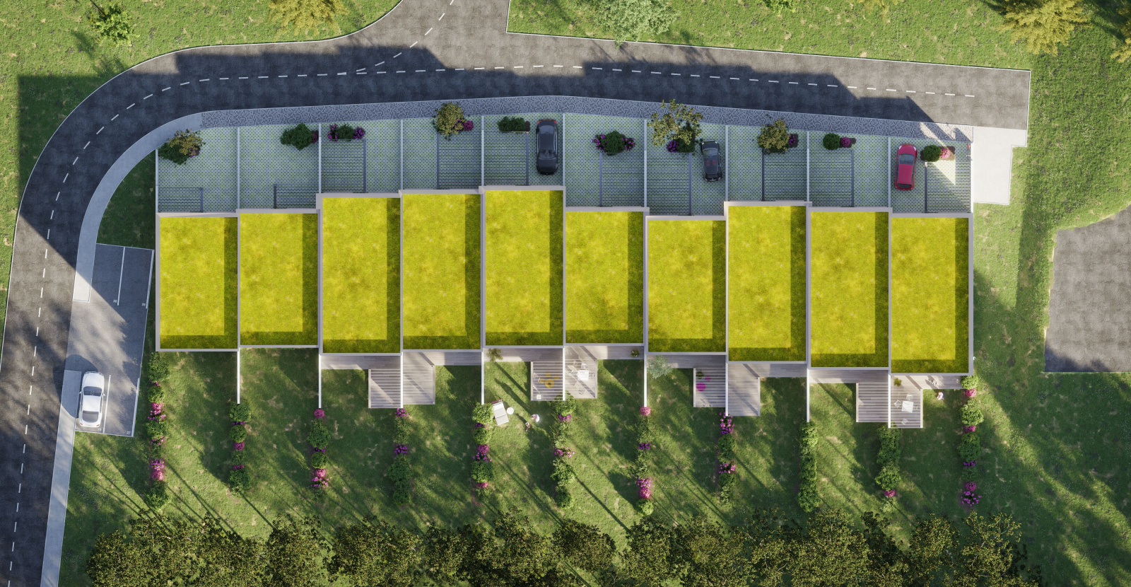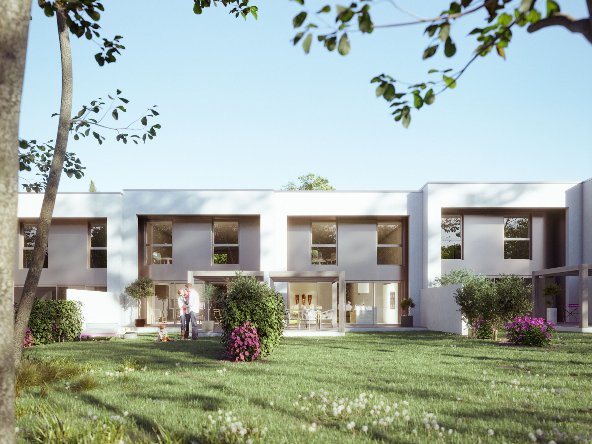 Las appartements de type T5 en duplex pour une surface totale de 121 m2 sont prolongés avec de belles terrasses de 24 m2 et des jardins exposés SUD.